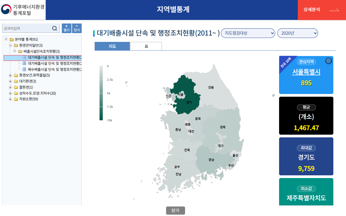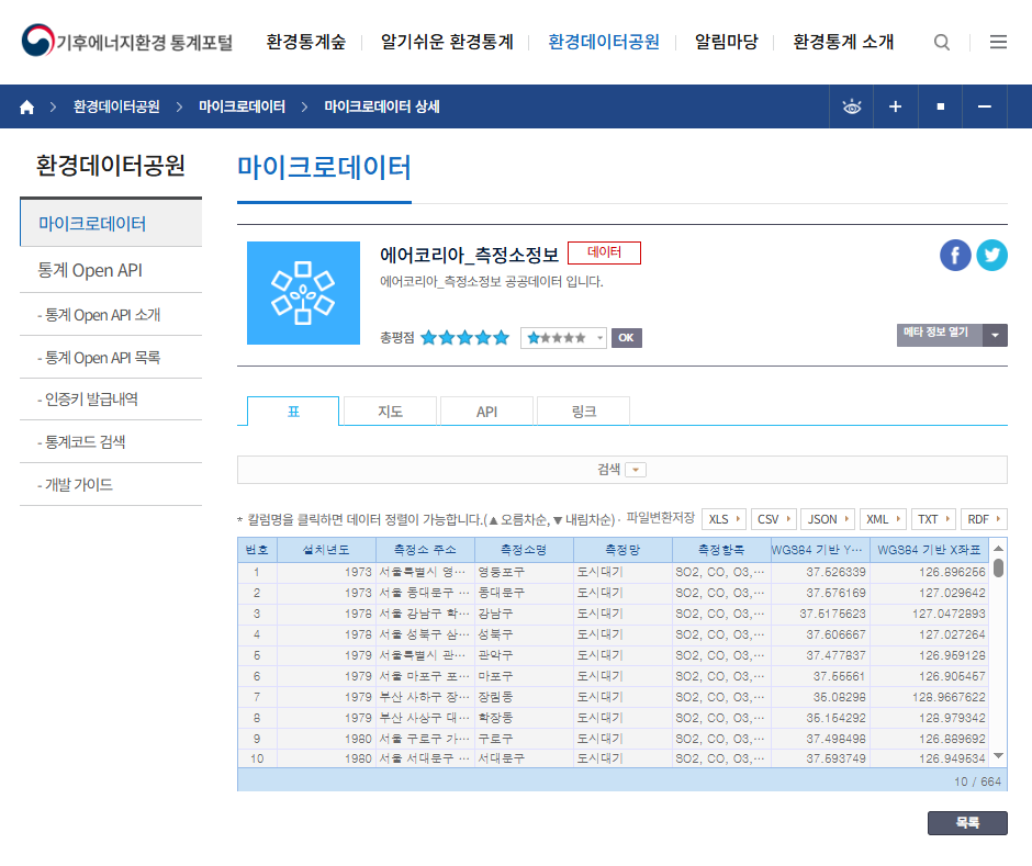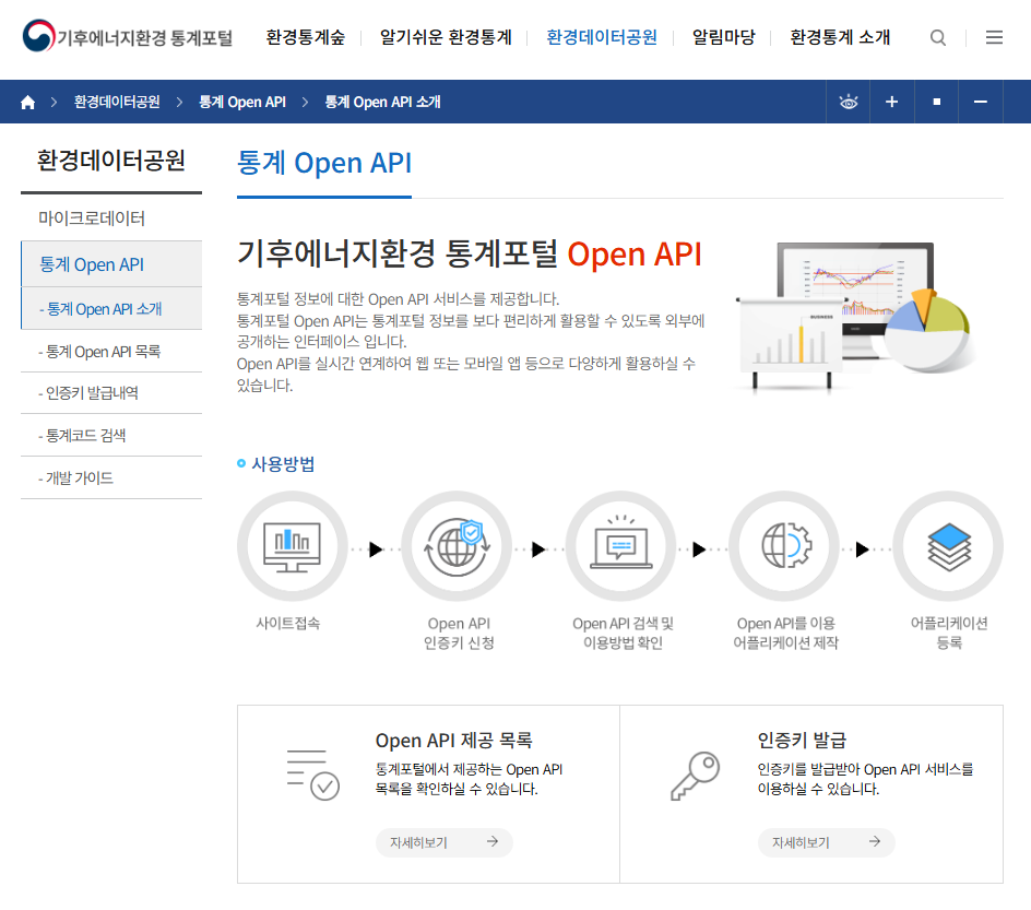 환경통계 Open API는 통계정보를 보다 편리하게 활용할 수 있도록 외부에 공개하는 인터페이스 입니다.